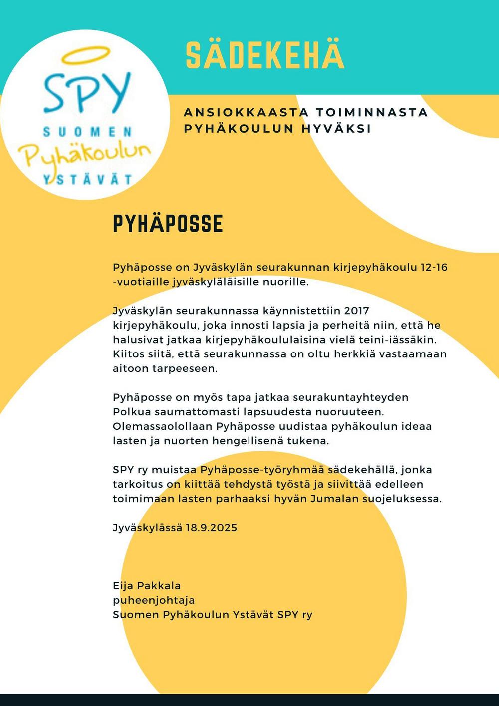 SPY tukee lapsen hengellistä, henkistä ja fyysistä hyvinvointia kunnioittavaa ja vahvistavaa pyhäkoulutoimintaa. Pyhäkoulussa lapsen omilla kysymyksillä ja kiinnostuksen kohteilla on merkitystä. PYHÄKOULUN YSTÄVÄT TUKEVAT SUOMEN EV. LUT. KIRKON PYHÄKOULUTOIMINTAA.
