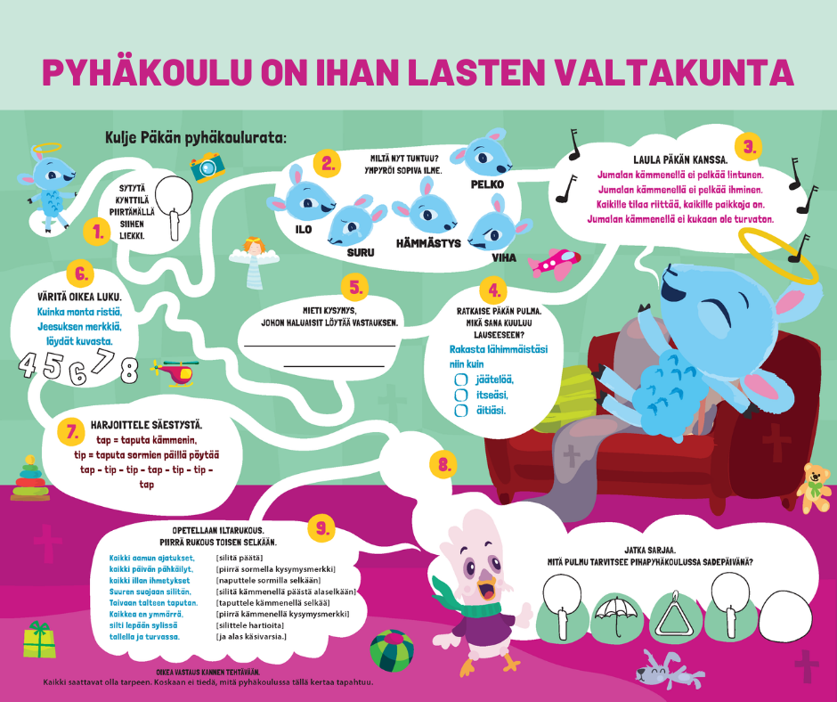 Pyhäkoulu on parhaimmillaan lasten valtakunta. Näin tapahtuu, kun lapset saavat leikkiä ja ihmetellä pyhäkoulussa. Raamatunkertomukset, lasten virret, rukous ja välittävä huolenpito toisista ovat tärkeitä elämän eväitä edelleen. Suomen Pyhäkoulun Ystävät tarjoaa Lastenkirkon käyttäjille tämän Päkän posti puuhatehtävän, jonka avulla voi tutustua pyhäkouluun. Materiaali sopii mainiosti osaksi kirjepyhäkoulua. Lataa Päkän posti tästä
