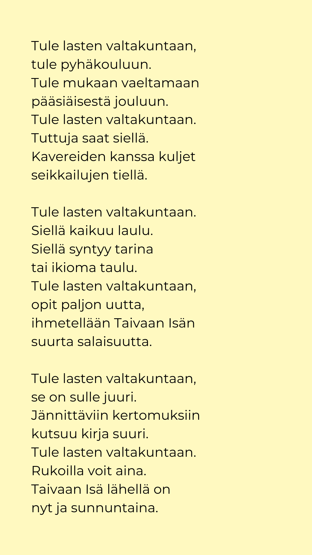Tule lasten valtakuntaan on Anna-Mari Kaskisen teksti uudeksi pyhäkoululauluksi. Sävellyskilpailun satona siihen saatiin 46 vaihtoehtoista sävellystä. Finaalissa valitaan voittajasävellys. Tapahtuman alussa paljastetaan kuusi esikarsinnan läpäissyttä sävelmää. Laulu lauletaan kaikilla vaihtoehtoisilla sävellyksillä ja hieman lorutellaan välillä. Yleisö pääsee valitsemaan yleisön suosikin ja tuomaristo pääsee koostamaan arvioinnit ja valitsemaan voittajasävellyksen.